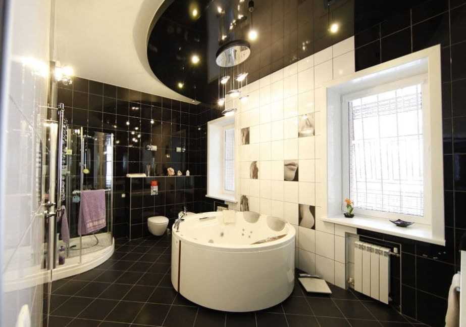 - Эффект неожиданности — вы окрашиваете потолок в темный цвет, например черный, серый или темно-синий, а остальная часть интерьера (настенная плитка, пол, санитарные объекты) выбирается в светлом цвете, например белом,