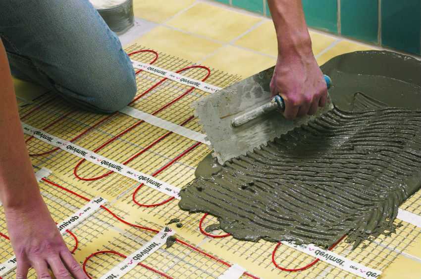 Но в силу требований СНиП, которые гласят о том, что электрические системы отопления в доме нельзя прокладывать под тяжелыми и сантехническими приборами, позволяется установка после. Заливка должна иметь толщину 30-70 мм.