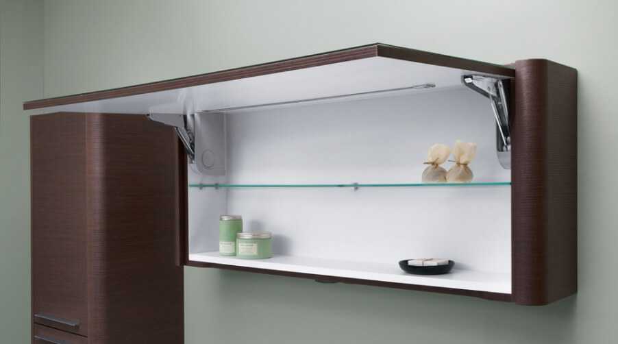 Еще бывают раздвижные дверцы, сдвигаемые вправо или влево. Это удобно – шкаф над умывальником занимает приличную часть свободного пространства, плюс открыты дверцы перед носом. Оптимально, когда шкаф расположен впритык к смежной стенке, дверца распахивается вдоль соседней поверхности.