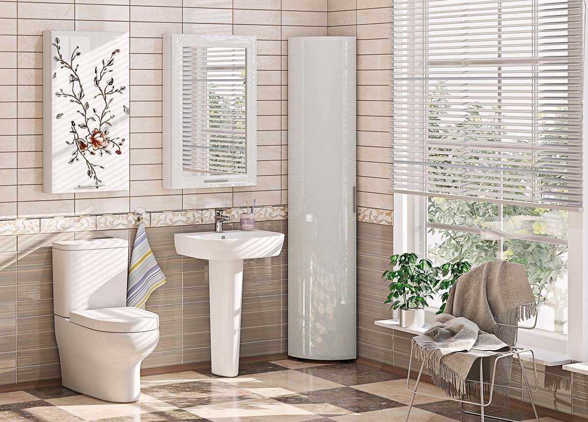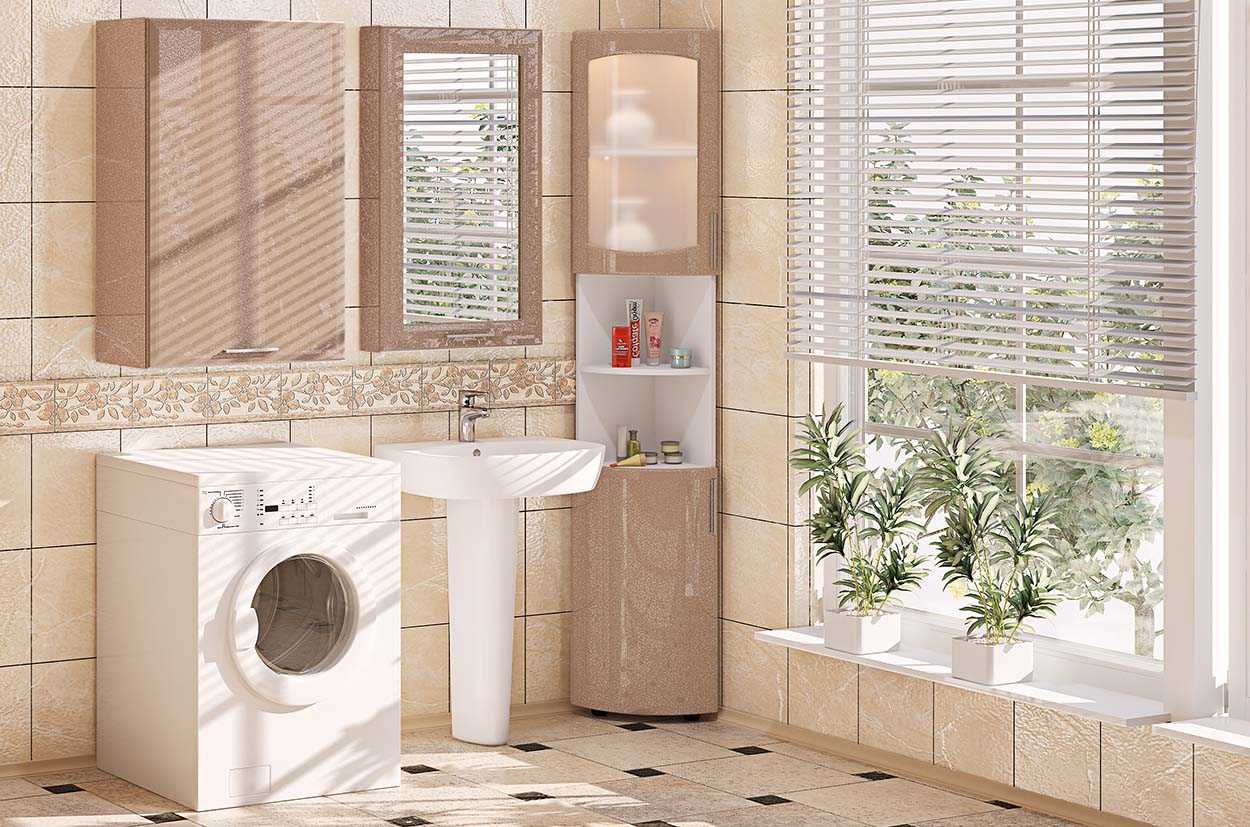 В большинстве случаев угловой шкаф представляет собой подвесной шкаф с зеркалом, закрепив его на стену можно освободить пространство внизу, что очень удобно и особенно востребовано в небольших ванных комнатах. Лучше всего располагать такой шкаф над угловой раковиной или стиральной машинкой. Основное достоинство шкафа заключается в том, что он оставляет свободное пространство внизу, играет многофункциональную роль и при этом очень эстетично выглядит.