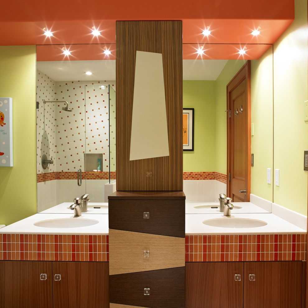 В таком стиле преобладают квадратные формы, угловая сантехника и мебель. Стены и пол украшены геометрическими узорами. Допускается наличие обоев и окрашенных поверхностей.