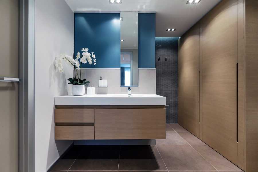 Косметика, бытовая химия, предметы гигиены и белье – всё это скрыто за фасадами шкафа, что позволяет в полной мере насладиться эстетикой интерьера