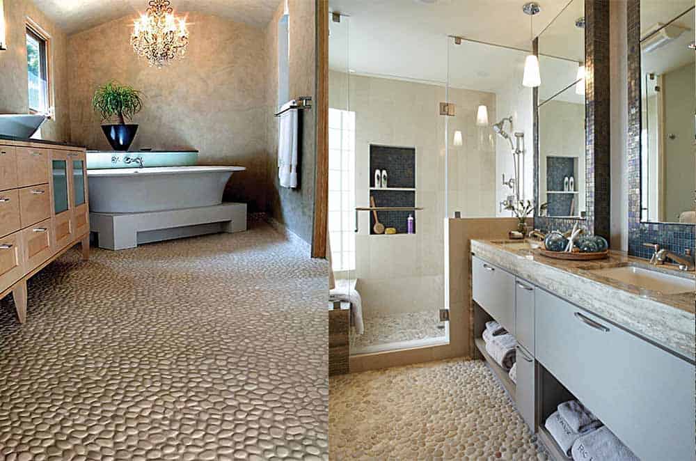 Еще один ошеломляющий вариант для дизайна ванной 2021 года: напольное покрытие, имитирующее морскую гальку.