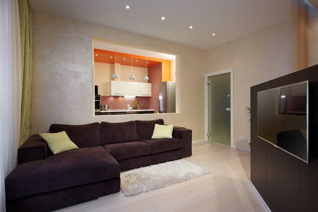 Проходная гостиная с мини-кухней часто встречается в предложениях для квартир-студий. Это решение, которое идеально подойдет для небольших участков, если вам небезразлично оптическое увеличение пространства. Очень часто бывают ситуации, когда владельцы однокомнатных квартир решают открыть маленькую кухню для гостиной. В результате границы между комнатами выравниваются, что создает впечатление простора.