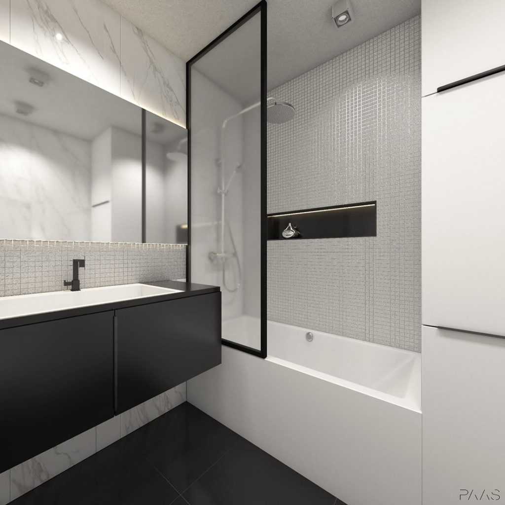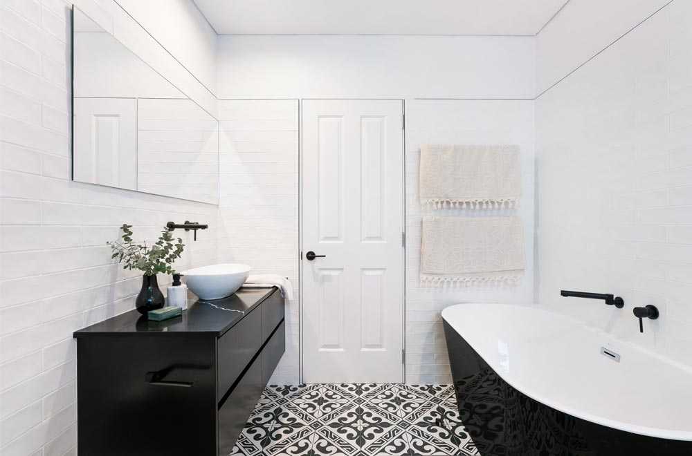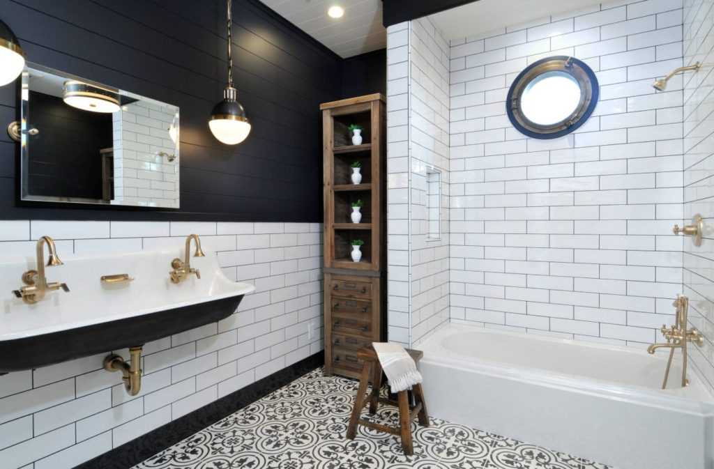 Черного оттенка в ванной может быть совсем чуть-чуть. Он может присутствовать здесь лишь в виде различных геометрических абстракций или разных полос на белоснежном полу, стеновых покрытиях и даже шторках.
