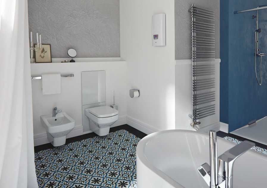 Керамическая плитка синего цвета, а также стилизованная фурнитура и смесители для ванной идеально подходят для этой эстетики. В продаже также имеются керамическая плитка и другие виды напольной плитки, которые выглядят так, словно на них повлияло бремя лет. Они дороже, чем стандартные, но в этом стиле они отлично подойдут к ванной.