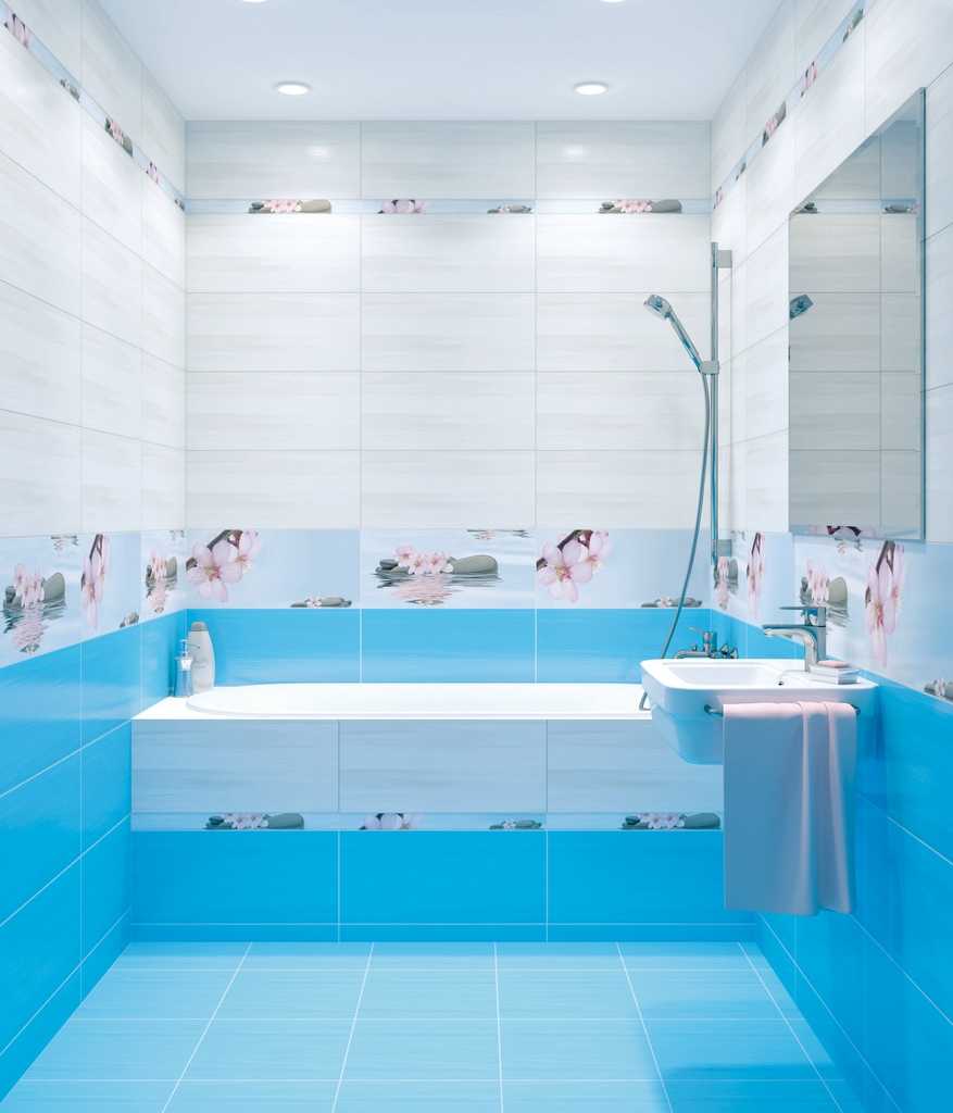 Голубая плитка для ванной считается по праву самой распространенной. Только многим не хочется отделывать ее все помещение равномерно. Современные веянья основываются на подборе минимум двух различных материалов.