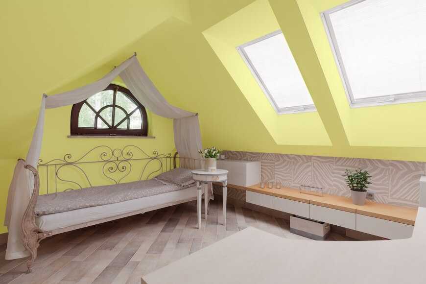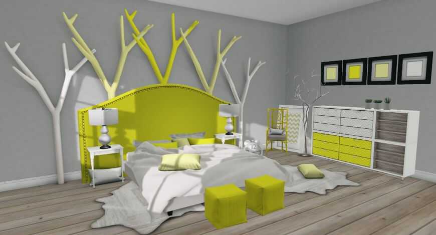 В спальне, где бал правит спокойствие, многие сочтут применение ярких цветов неуместным. С другой стороны, именно здесь мы пробуждаемся по утрам, и заряд бодрости, особенно для людей-«сов», крайне важен. Насыщенно-желтые обои в интерьере будут лишними, а вот отдельные яркие пятна (ваза, настенное панно, постельный текстиль) дадут необходимый стимул и энергию.