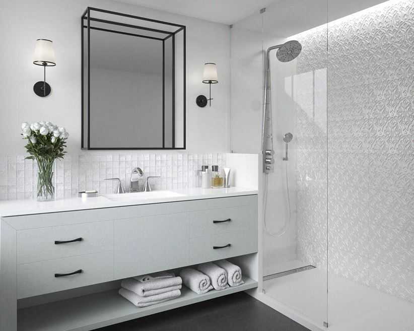 Другой вариант: выложить пол в ванной комнате итальянской плиткой с хаотично расположенными на ней бело-серыми камнями, в отделке стен использовать глянцевую плитку с нежным орнаментом белых тонов.