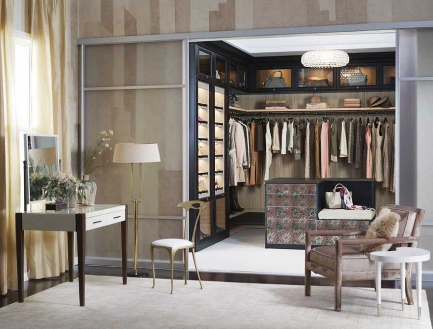 Еще один популярный вариант – угловая гардеробная. Она хороша тем, что занимает не так уж много места. Когда гардеробная находится в углу, рядом с ней можно разместить туалетный столик или кровать.