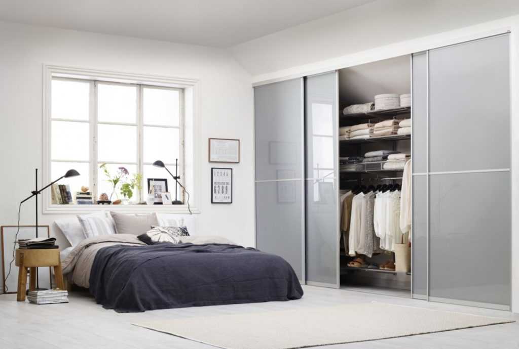 Для владельцев маленьких спален отличным решением будет организация гардеробной-купе с раздвижной дверью. Обычно перегородки монтируются с помощью металлопрофиля и гипсокартона, что позволяет сэкономить место. Внутри можно использовать готовые модульные системы хранения.