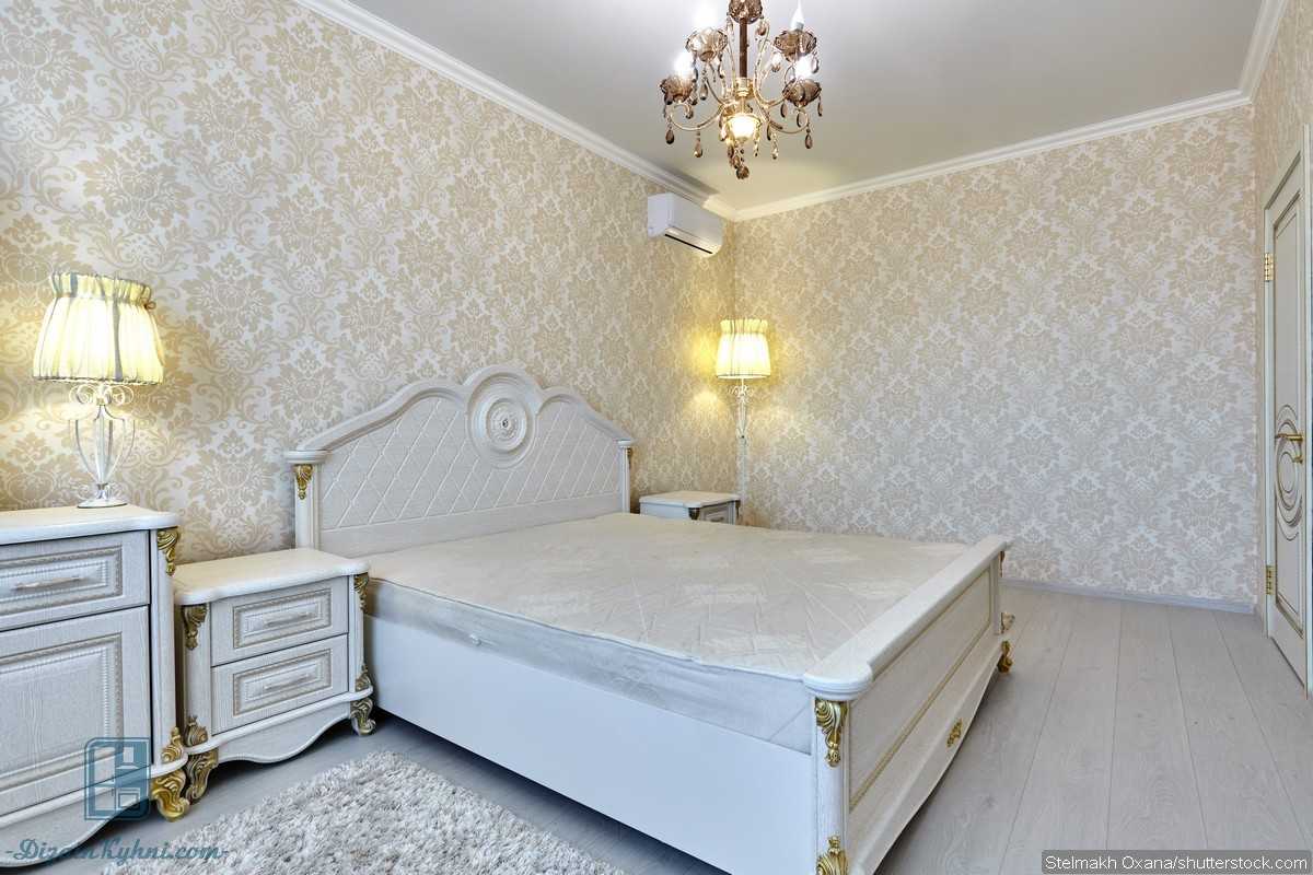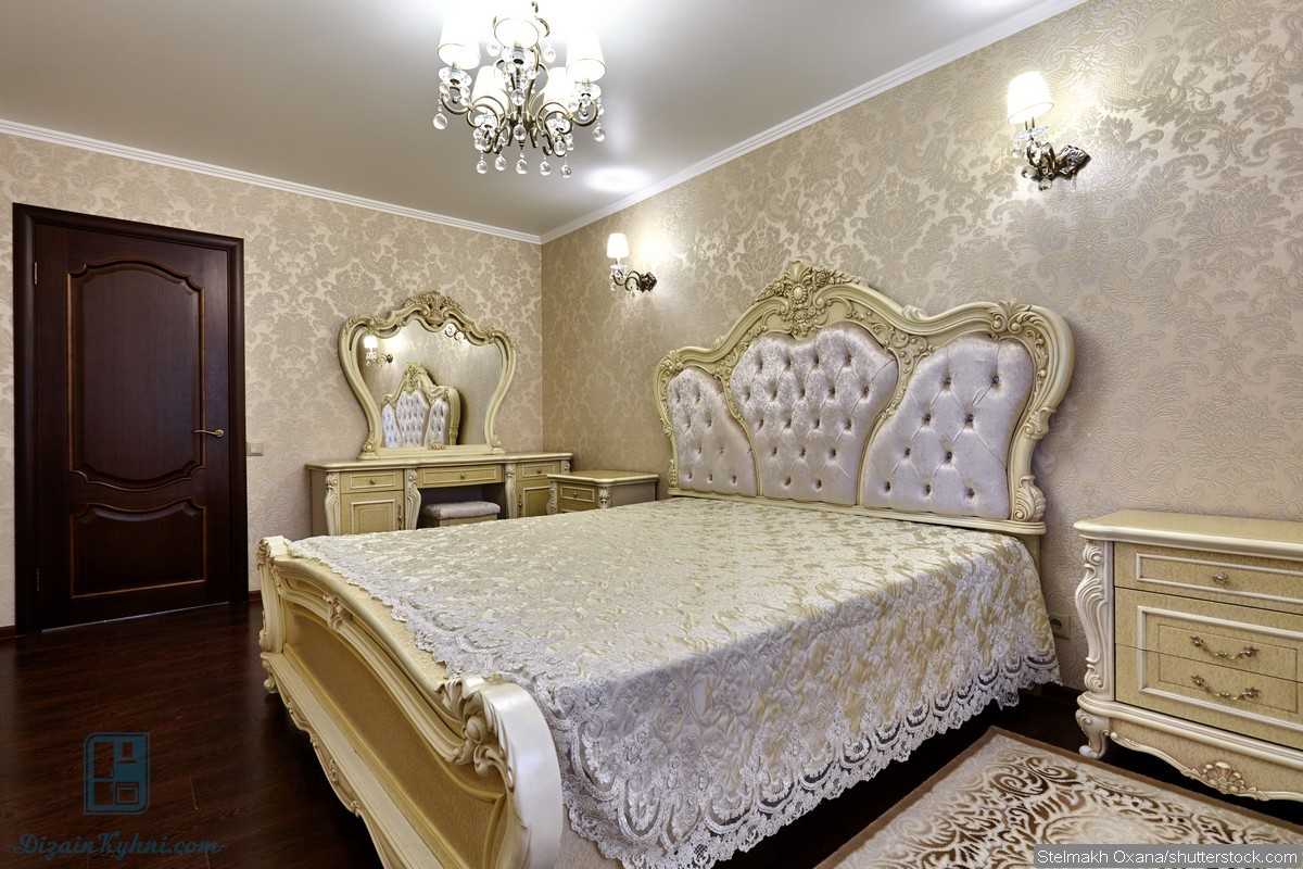 • Классический стиль. Если вам нравится роскошь, этот вариант оформления для вас. В данном стиле сочетаются розовые, белые, персиковые тона и гипсовая лепнина, люстры из хрусталя, колонны. Выбирайте кровать с изголовьем, оббитым мягкой кожей. Отлично подходит резная мебель оттенка слоновой кости. Для оформления штор подойдет бархат или атлас, которые подходят к тону общего интерьера. Тот же материал можно использовать для балдахина;