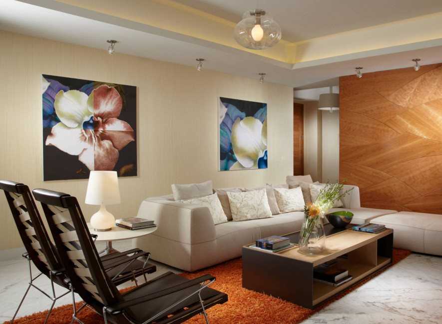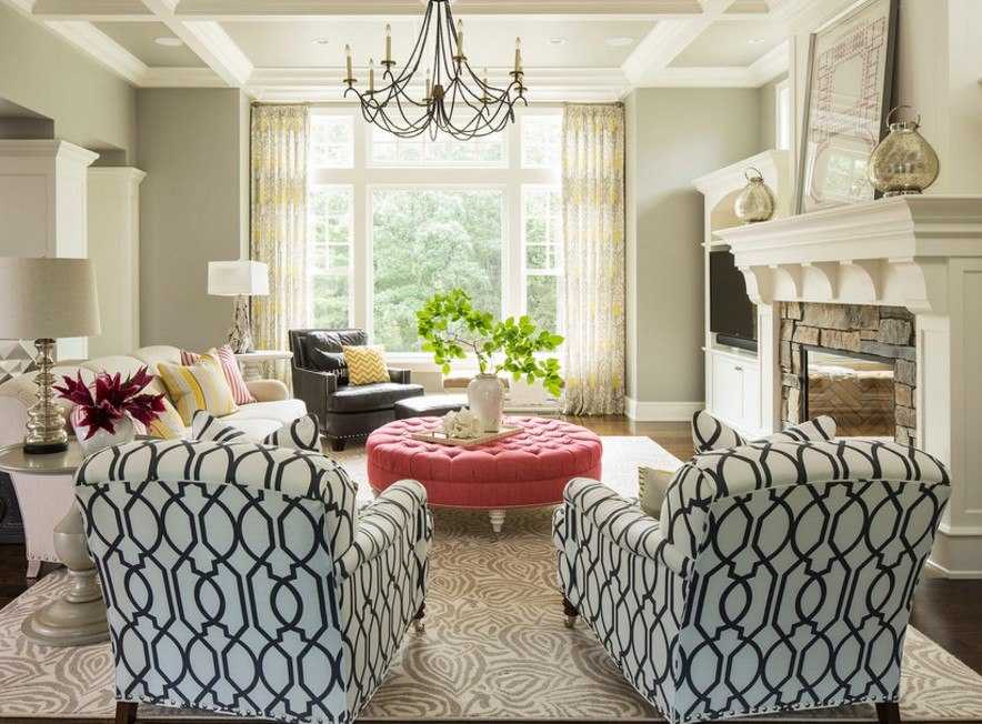 Если кресла служат акцентами, то рисунок обивки может быть более ярким и контрастным. При этом текстильные элементы — покрывала, шторы, ковры стоит подбирать в соответствии с узором на креслах.