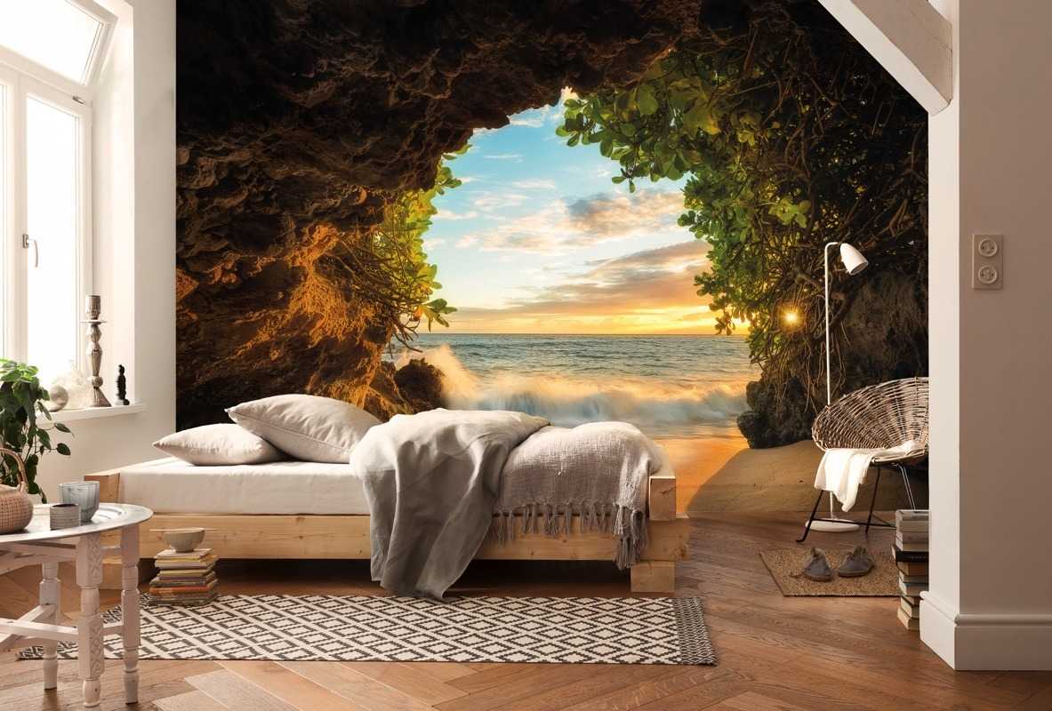 - В маленькой спальне без окон избавиться от ощущения замкнутого пространство помогут фотообои с изображением открытого окна и искусственный свет.