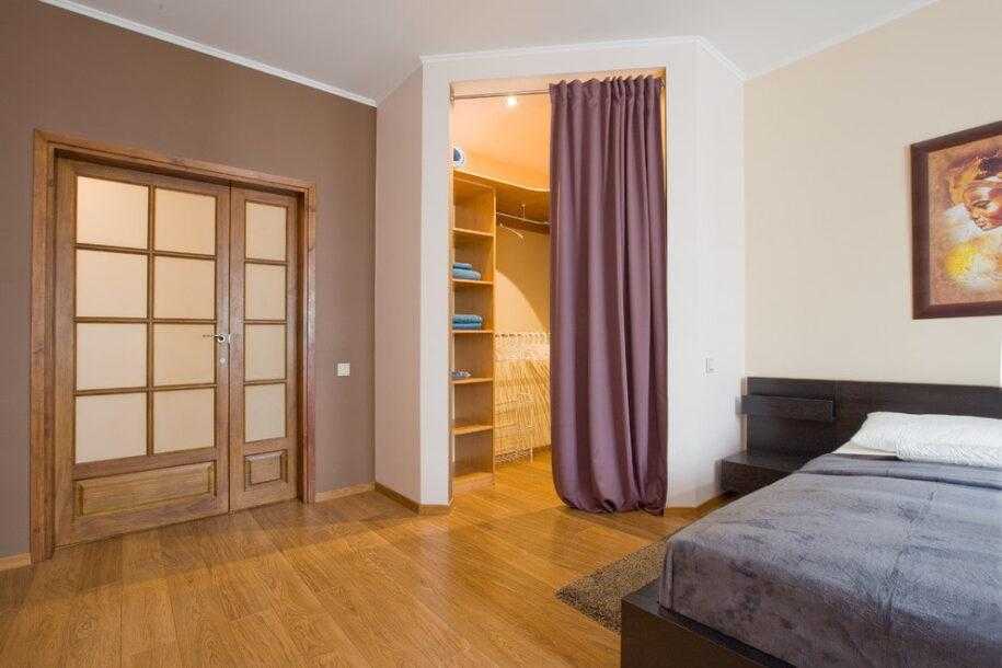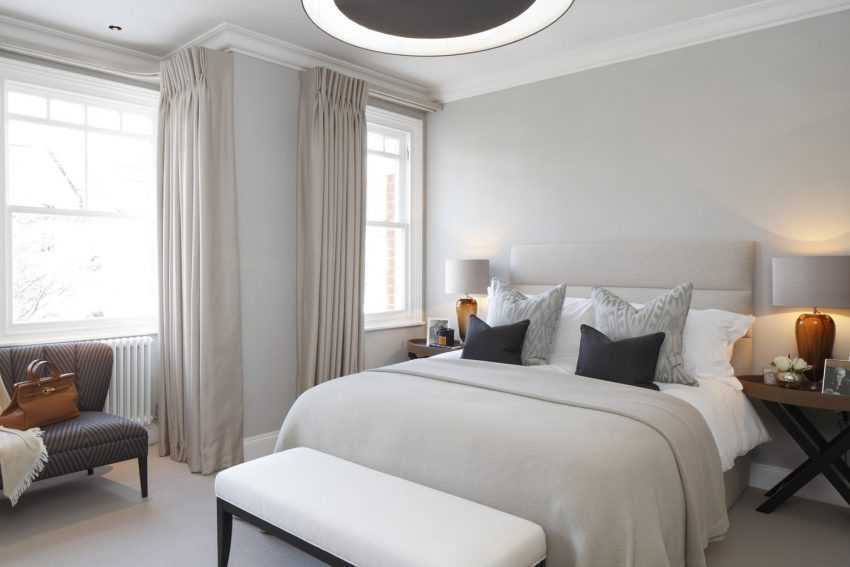 Хорошо будут смотреться занавеси с подхватами или на люверсах. А французские шторы с поперечными сборками сделают дизайн спальни с двумя окнами поистине королевским.