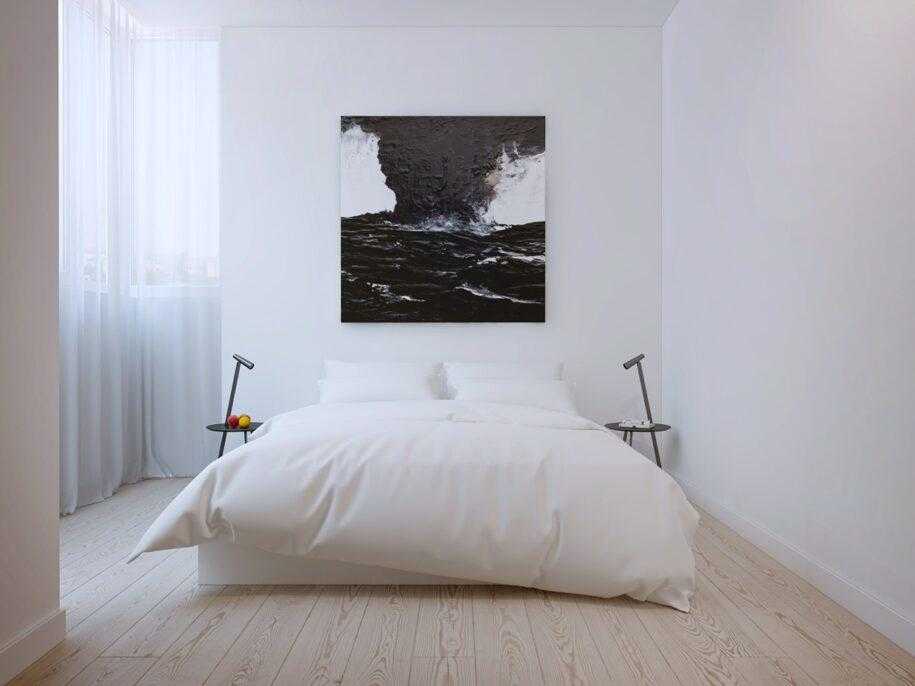 интерьер спальни в светлых тонах будет строиться на контрасте белого и