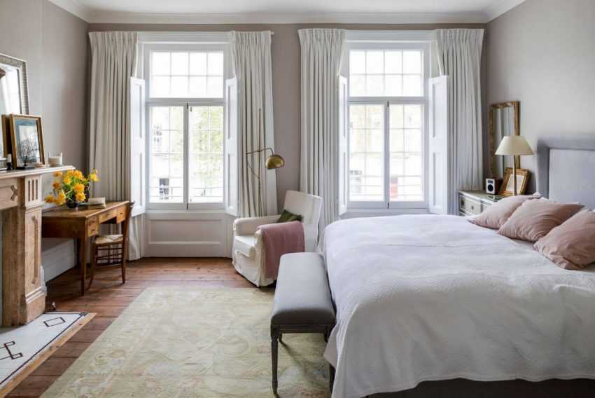 Дизайн спальни с двумя окнами будет немного сложнее. Он будет зависеть от расположения проемов. Если они расположены близко, то конструкция из штор может быть одна на два окна. При значительном расстоянии каждый проем декорируется отдельно, желательно, в классическом стиле.