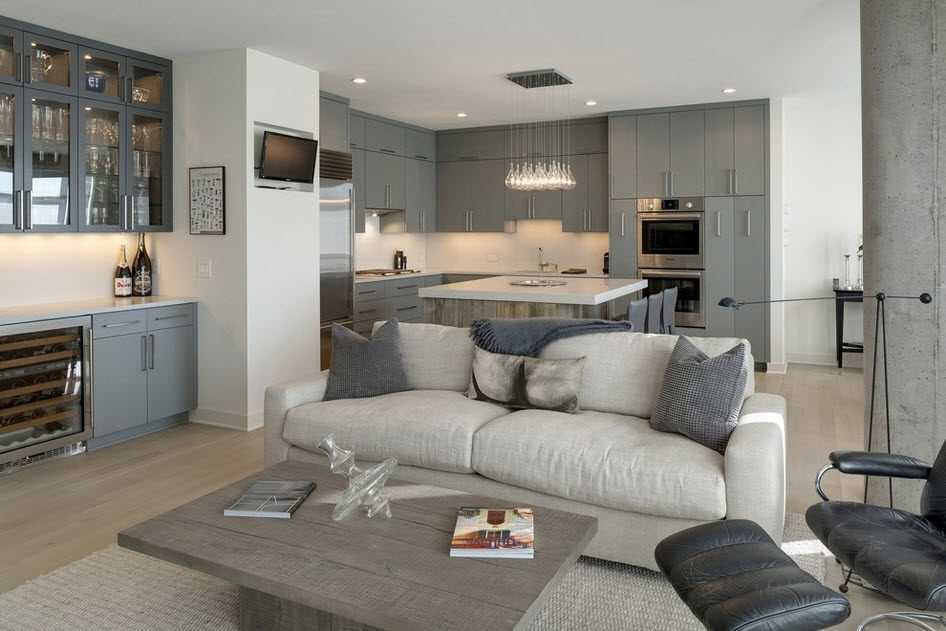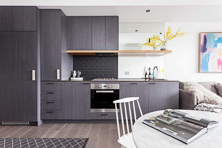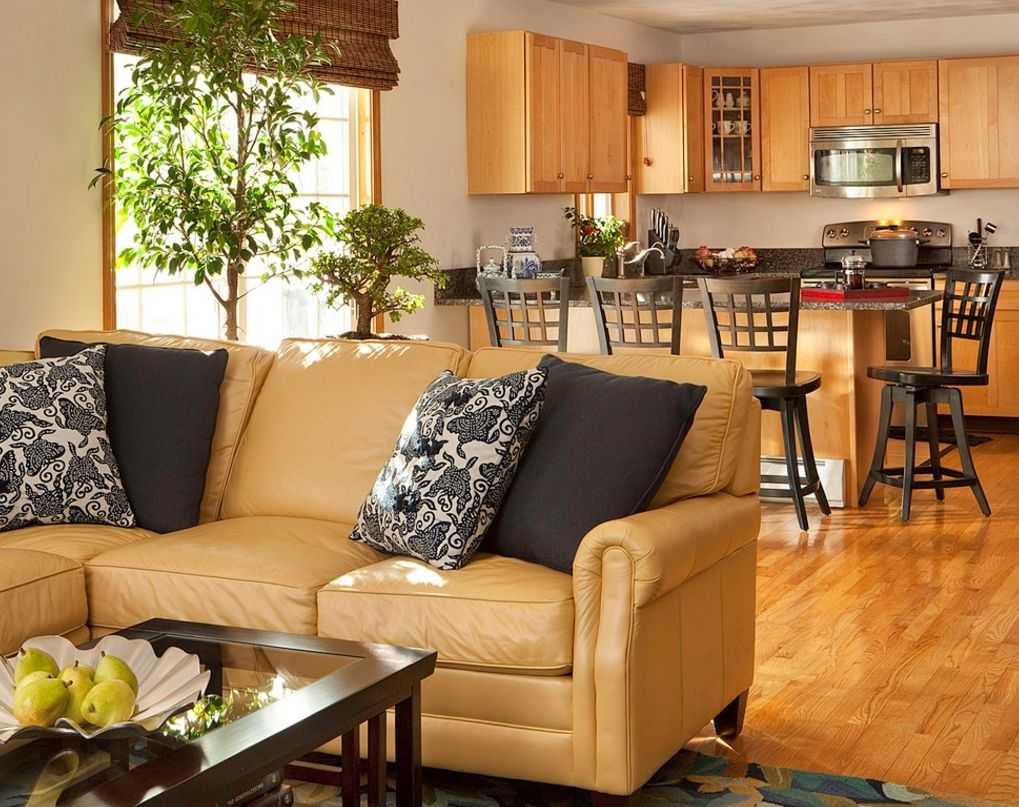 Чтобы не потерять драгоценные метры, в дизайне кухни-гостиной используют адаптированную мебель – угловой шкаф или диван. Занимая скромное место в углу, подобные модели предоставляют место для свободного движения на кухне.