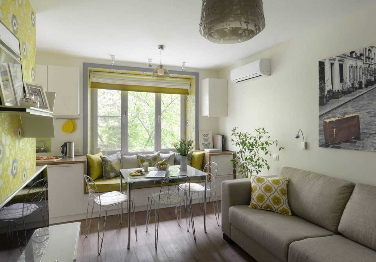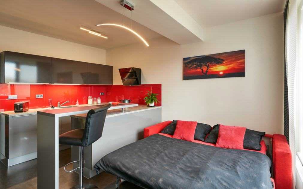 Свободное место значительно сокращается. В этом случае на кухне со спальной зоной нужно установить аккуратный мини-диван. Кулинарные эксперименты хозяев во время приготовления и непосредственной дегустации блюд могут загрязнить поверхность мягкой мебели
