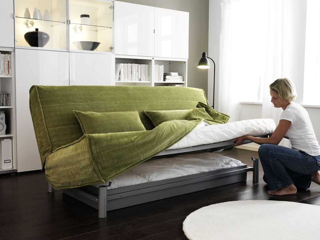 Для спальни можно приобрести диваны типов «книжка» или «клик-клак», они занимают мало свободного пространства даже в разложенном виде. Особенно актуально такое предложение, если предполагается поставить мебель вдоль стены. Если позволяет расположение мебели в комнате и наличие места, можно остановить свой выбор на следующих моделях: «аккордеон», диван с выкатом, диван-раскладушка. Неплохим вариантом для сна будет наличие у дивана ортопедического покрытия.