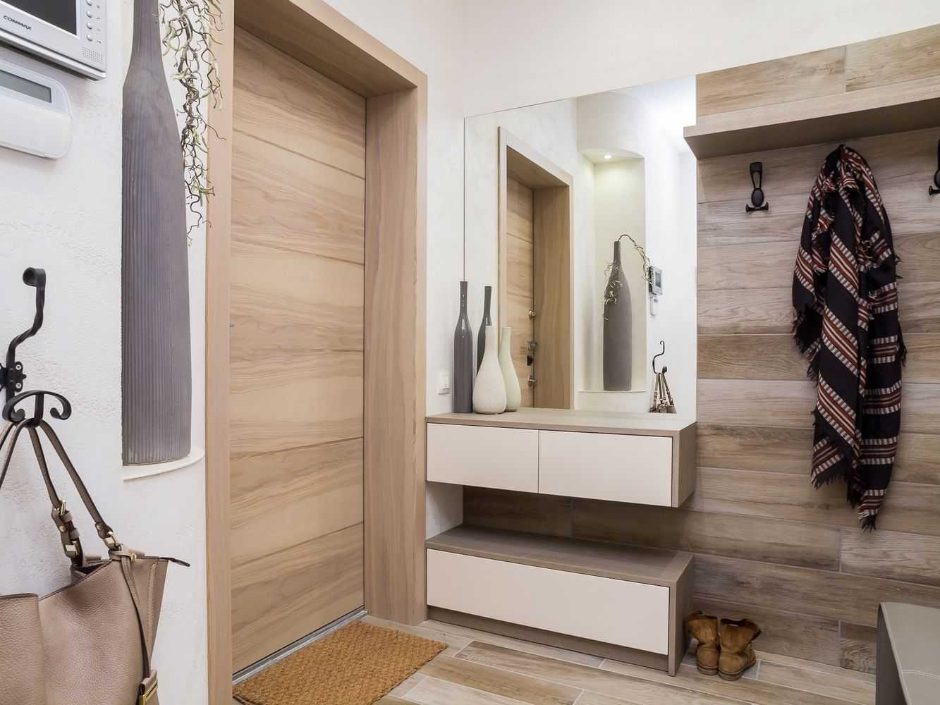 Здесь же можно разместить вешалку – тогда висящая одежда не будет создавать нагромождения и беспорядок в коридоре. Оформи стену красивым отделочным материалом, например — деревянной панелью, подведи светодиодную подсветку. Получится не только практично, но и очень красиво.