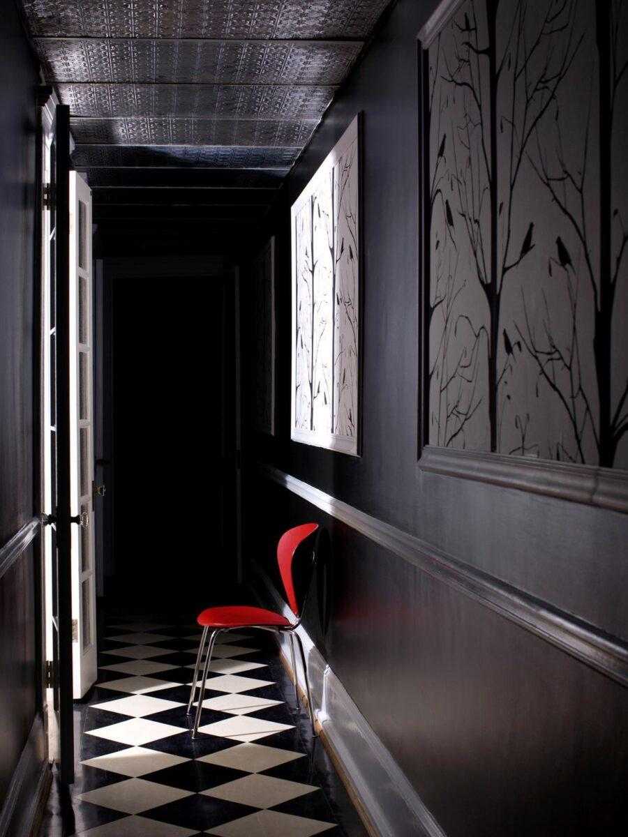 Надо заметить, что панели и точечные светильники могут простилаться на стыке потолка и стен или над входной дверью. Стильная черная прихожая в любом случае гарантирована. Главное, чтобы несущая и рассеивающая части светильников были одноцветными (светлые конструкции сами по себе интересны на черном фоне).