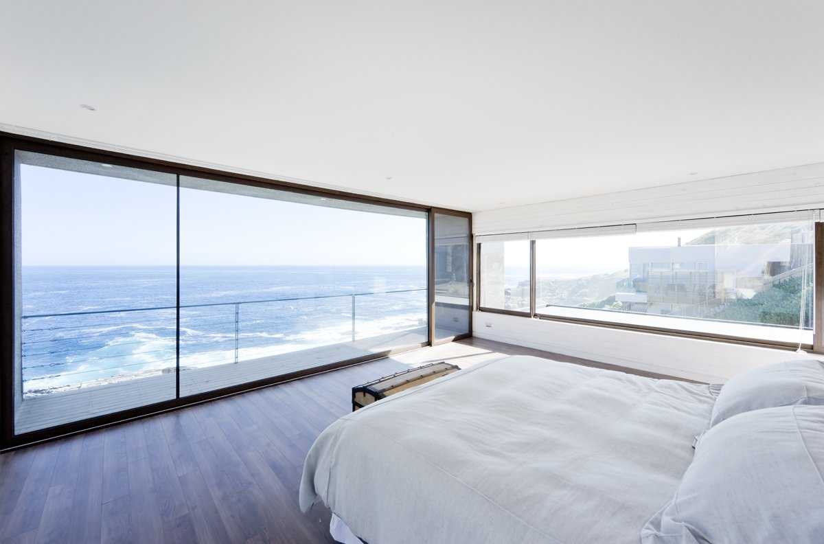 Спальня в стиле хай-тек с полупрозрачными шторами во всю стену комнаты