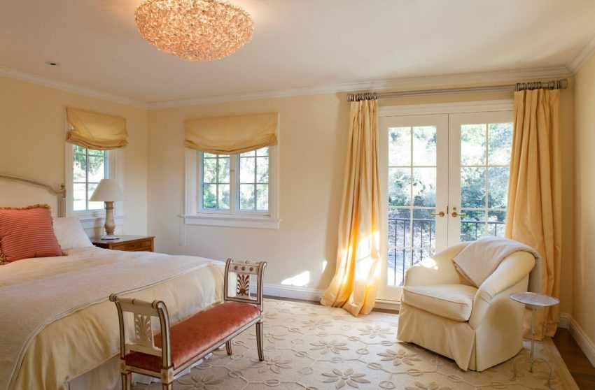 Хорошо будут смотреться занавеси с подхватами или на люверсах. А французские шторы с поперечными сборками сделают дизайн спальни с двумя окнами поистине королевским.