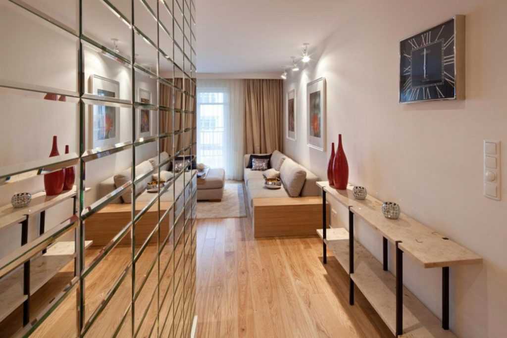 В такой прихожей трудно правильно разместить мебель.Чтобы этого добиться, да и к тому же сгладить разницу в размерах стен, можно помещение зонировать. В такой прихожей сделайте многоуровневый потолок, а стены и пол здесь могут быть комбинированными. Среди идей дизайна прихожей сюда отлично подходит вариант с зеркалами, которые нужно разместить на длинных стенах, либо фотообои, имеющие глубокую перспективу.