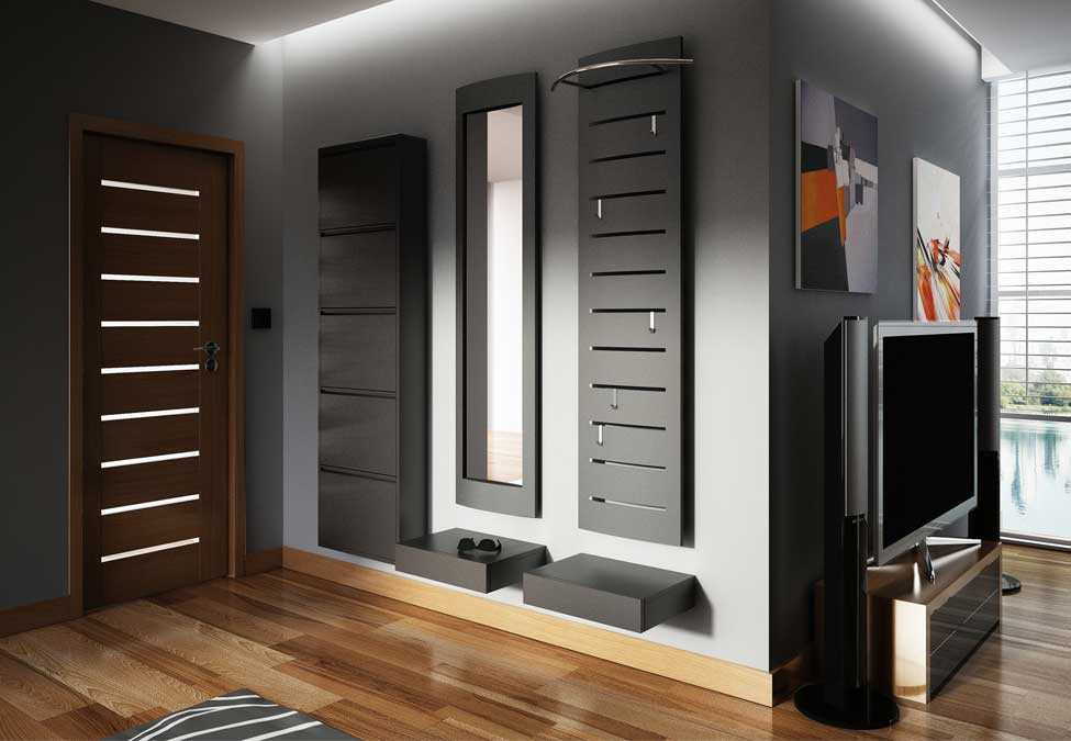 Черная отделка деталей интерьера. Это направление используют в стиле арт-деко, где черному цвету отводится ключевое место. Лаконичность и строгое расположение элементов гарнитура прекрасно сочетаются с темными красками. Однако, для маленьких прихожих этот вариант совершенно не подходит.