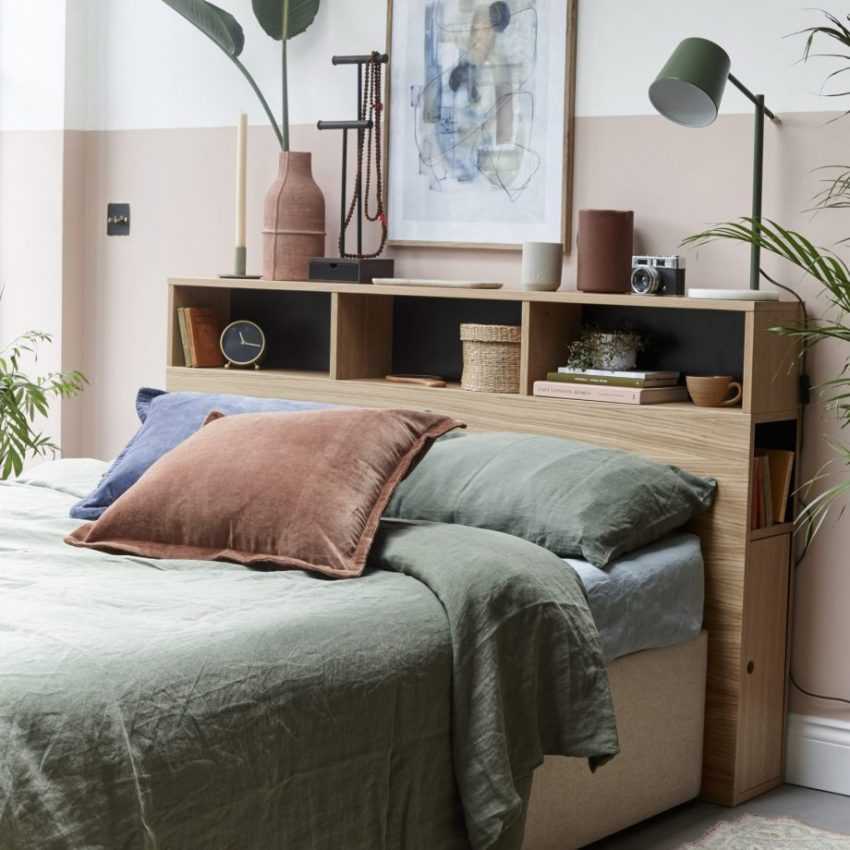 Обычно в стандартных гарнитурах используют 2 прикроватные тумбочки. В нашем случае, их лучше заменить оригинальными навесными полочками, что в итоге нам сэкономит ценные метры.