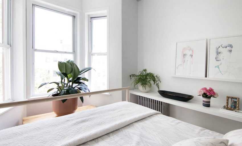 Ну и конечно, говоря о подоконниках, невозможно не вспомнить о комнатных растениях. Не стоит превращать спальню в тропические джунгли. Достаточно одного-двух цветов в небольших изящных горшках. А если установить пару горшков с высокими декоративными кустарниками в разных углах, то даже самая крошечная комната будет выглядеть визуально больше и объёмнее.