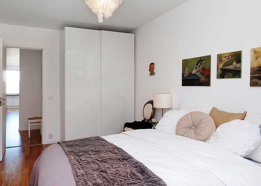 Маленькую спальню с большой кроватью дизайнеры рекомендуют выполнить в скандинавском стиле. Направление максимально близко по духу традиционному минимализму. Здесь царствует природная естественность, обилие светлых красок в оформлении. В результате интерьер выглядит естественно и прохладно.