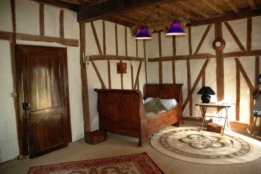 - В комнатах рекомендуется устанавливать массивную мебель из натурального дерева, а в качестве элементов декора использовать кухонную утварь и различные предметы старины, например кухонный ухват, кованый деревянный сундук, и пр.