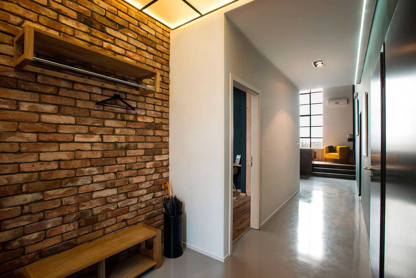 Весьма популярен кирпич в интерьере прихожей, однако он занимает полезную площадь комнаты.
