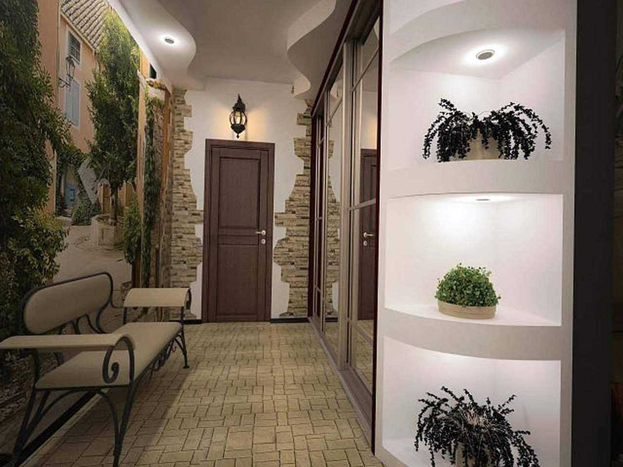 Длинный узкий коридор. Подобная форма комнаты предполагает размещение мебели по основным стенам. Самым удачным вариантом будет компактный узкий диван с вместительным ящиком для хранения.
