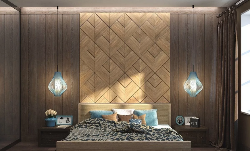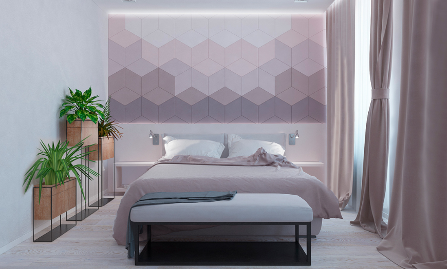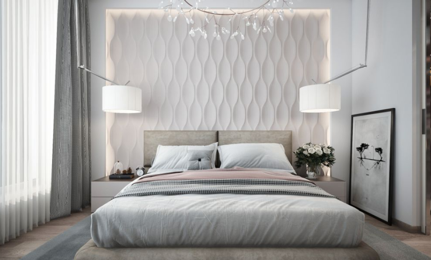 Для акцента стены за изголовьем кровати отлично подходят обои с узором или объемными изображениями. Продолжение вертикальных полос до светильника создает иллюзию зеркального отражения.