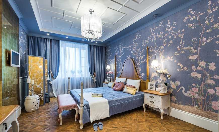 Оттенки неба и воды оказывают успокаивающее влияние на человека, поэтому для спальни они подходят как нельзя лучше. Синие обои можно комбинировать с белыми, серыми, бежевыми, пурпурными, темно-коричневыми, а также дополнять фотообоями.