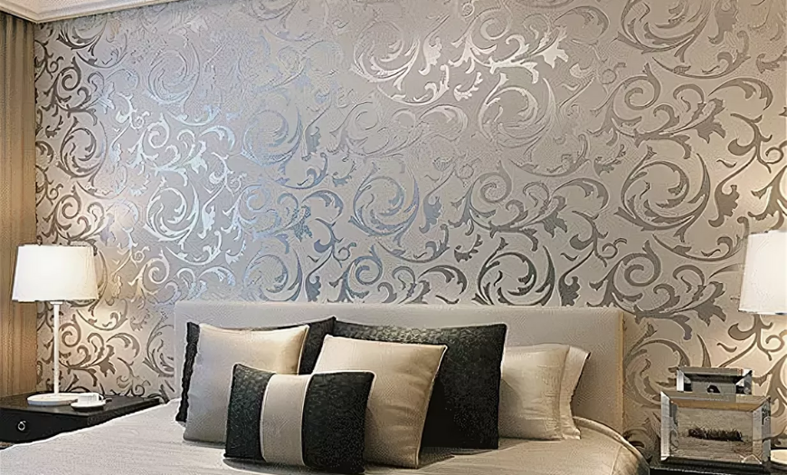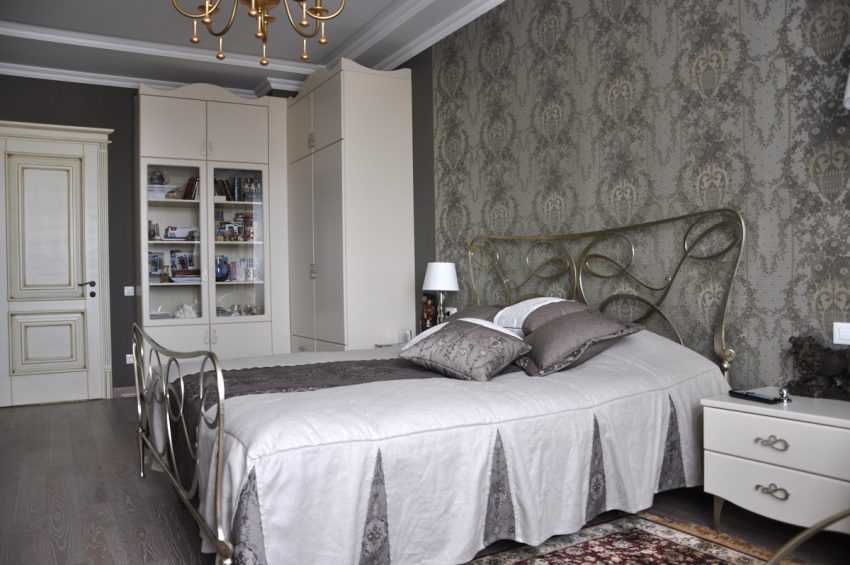 Спальня в черно-белых тонах, на фото изящные орнаментальные обои