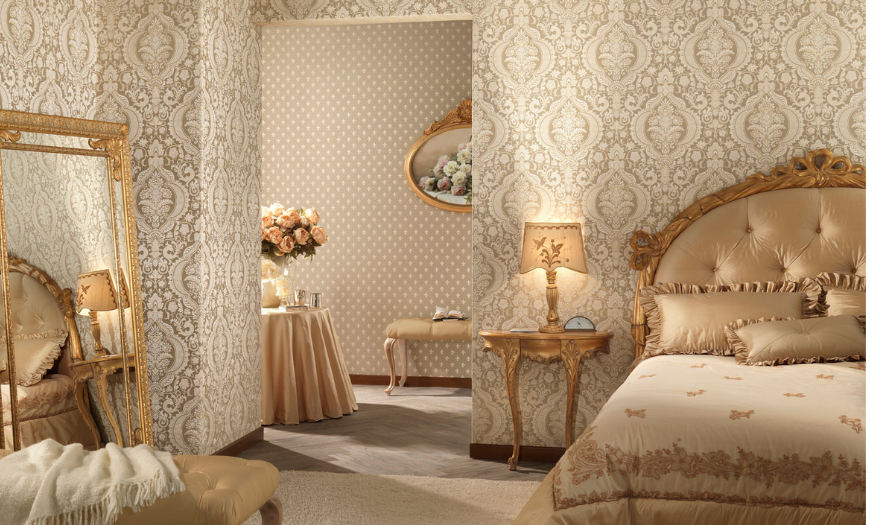 На фото интерьер спальни с золотыми полосатыми обоями в классическом стиле.