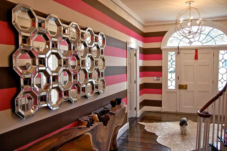 Отлично работают горизонтальные и вертикальные рисунки. Не обязательно выбирать строгие полосы, можно использовать узоры. Горизонтальное расположение зрительно сделает помещение шире, а вертикальный рисунок приподнимет потолки.