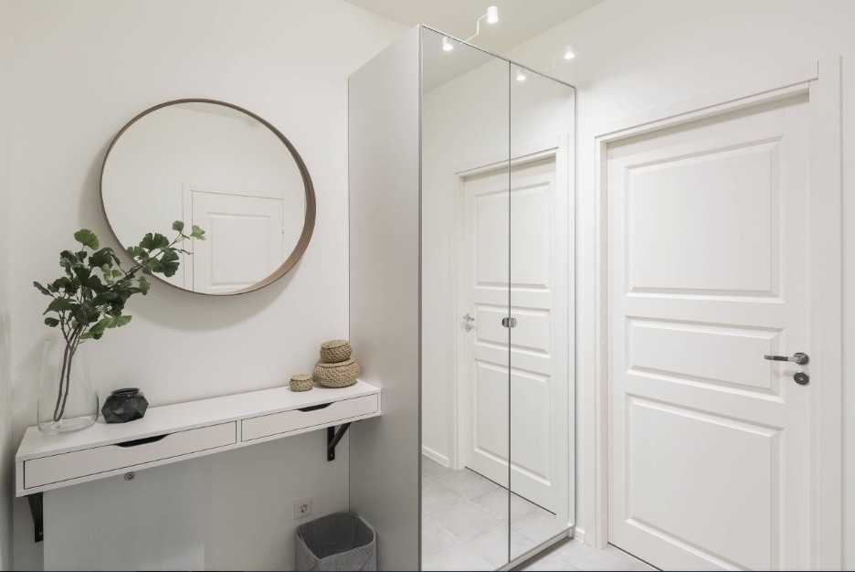 Нередко в качестве декоративного элемента прихожей выбирают зеркала. С их помощью можно визуально увеличить помещение. Ну и в целом считается, что это обязательный аксессуар, который необходим в каждой прихожей. Пожалуй, самый популярный вариант в современном мире – это шкаф-купе с зеркальными дверцами. Он выполняет не только декоративную, но и функциональную роль. Ведь внутри него есть множество разных отсеков для хранения вещей разного размера. К тому же, существует большое разнообразие вариантов, среди которых можно найти наиболее подходящее решение для вашей прихожей.
