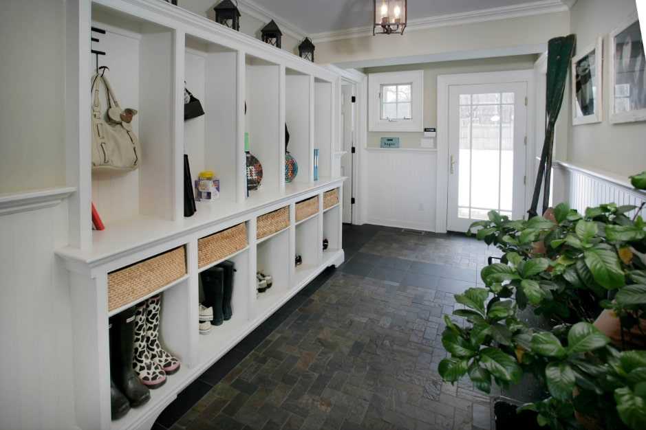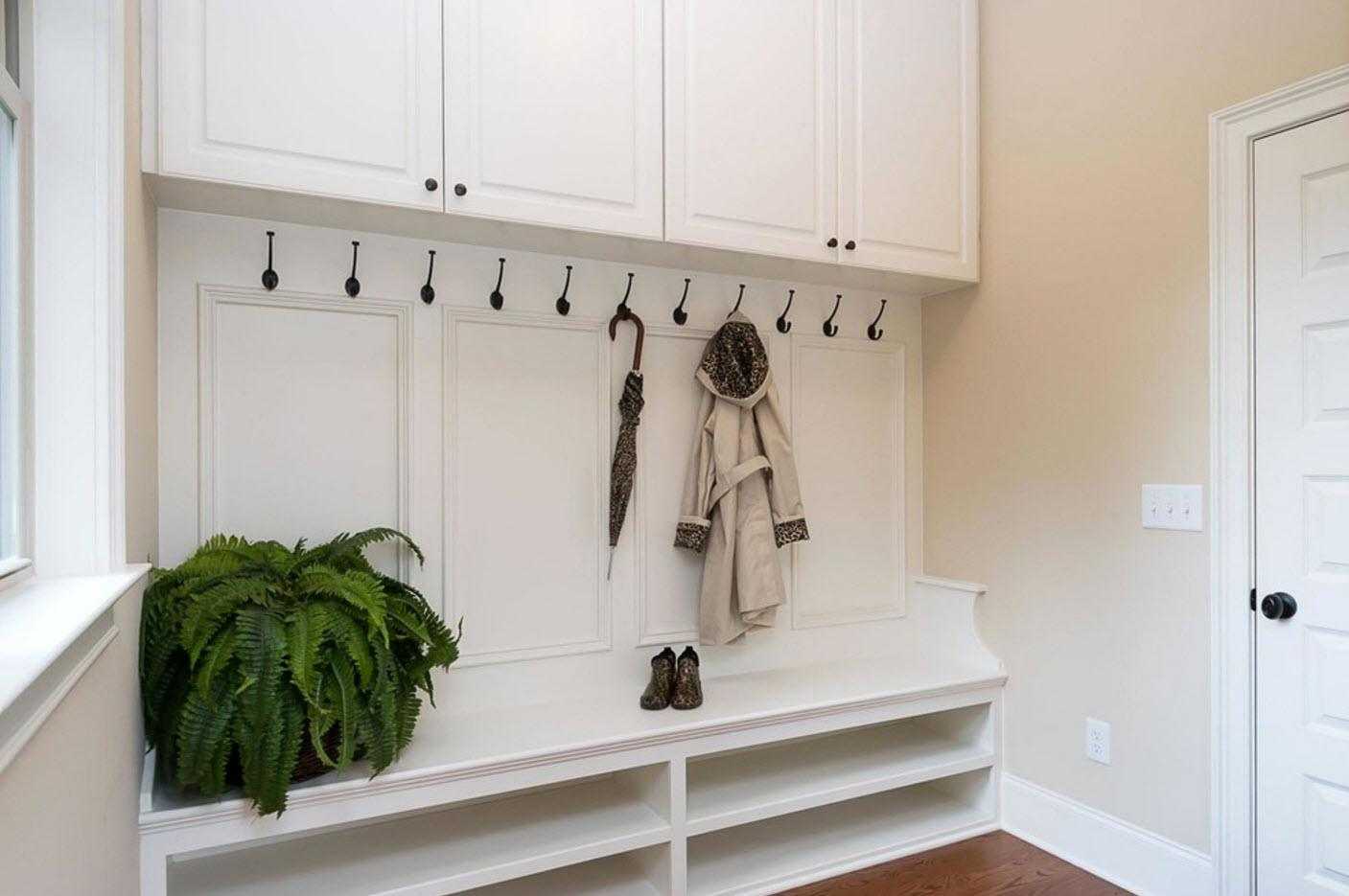 Огромный шкаф, размещенный в просторной прихожей, имеющий достаточно места, чтобы убрать в него все вещи, которые нужно оставлять, заходя в дом, может быть совершенно незаметным, если он находится в нише, а его двери выкрашены в тот же цвет, что и стены.