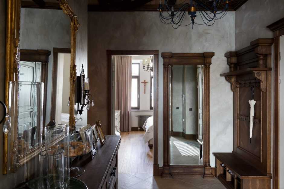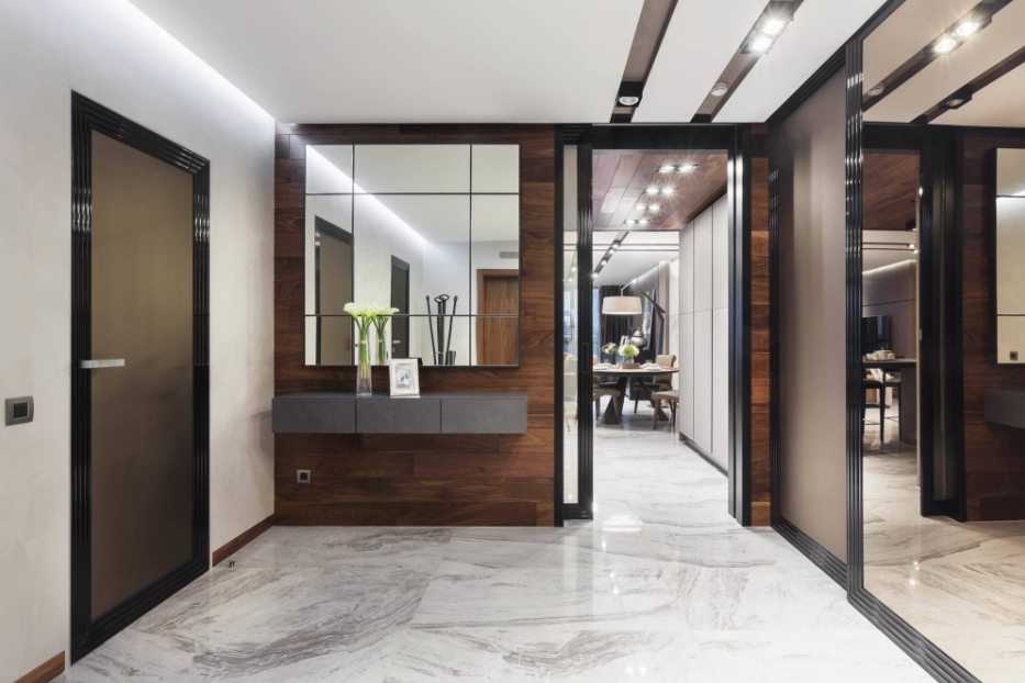 Отличным решением станет применение встроенной мебели: шкафов, полочек для обуви, вешалки в нише. На противоположной стороне можно разместить несколько зеркал и настенных светильников.