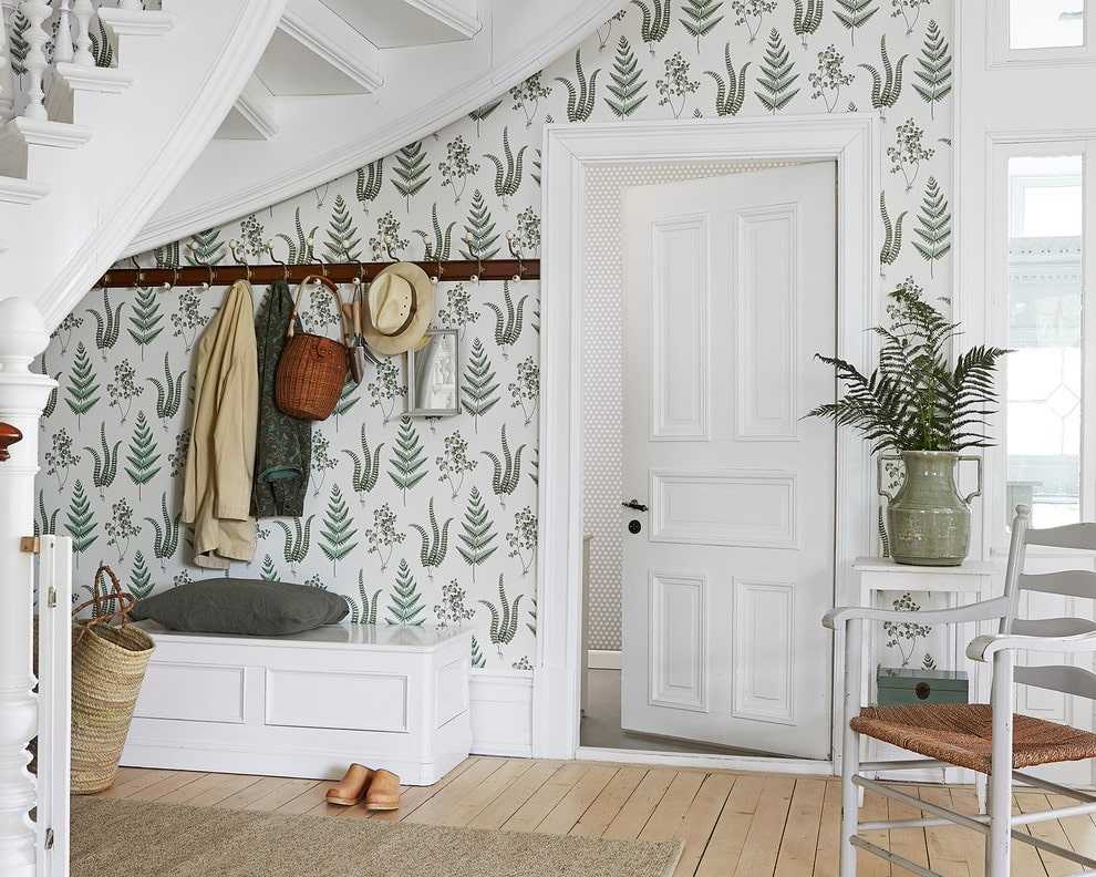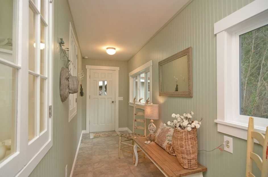 Первостепенный цвет стиля — это белый, делающий прихожую предельно светлой. Белый цвет в интерьере можно сочетать с бежевым, лазурным, светло-зелёным или светло-пепельным.