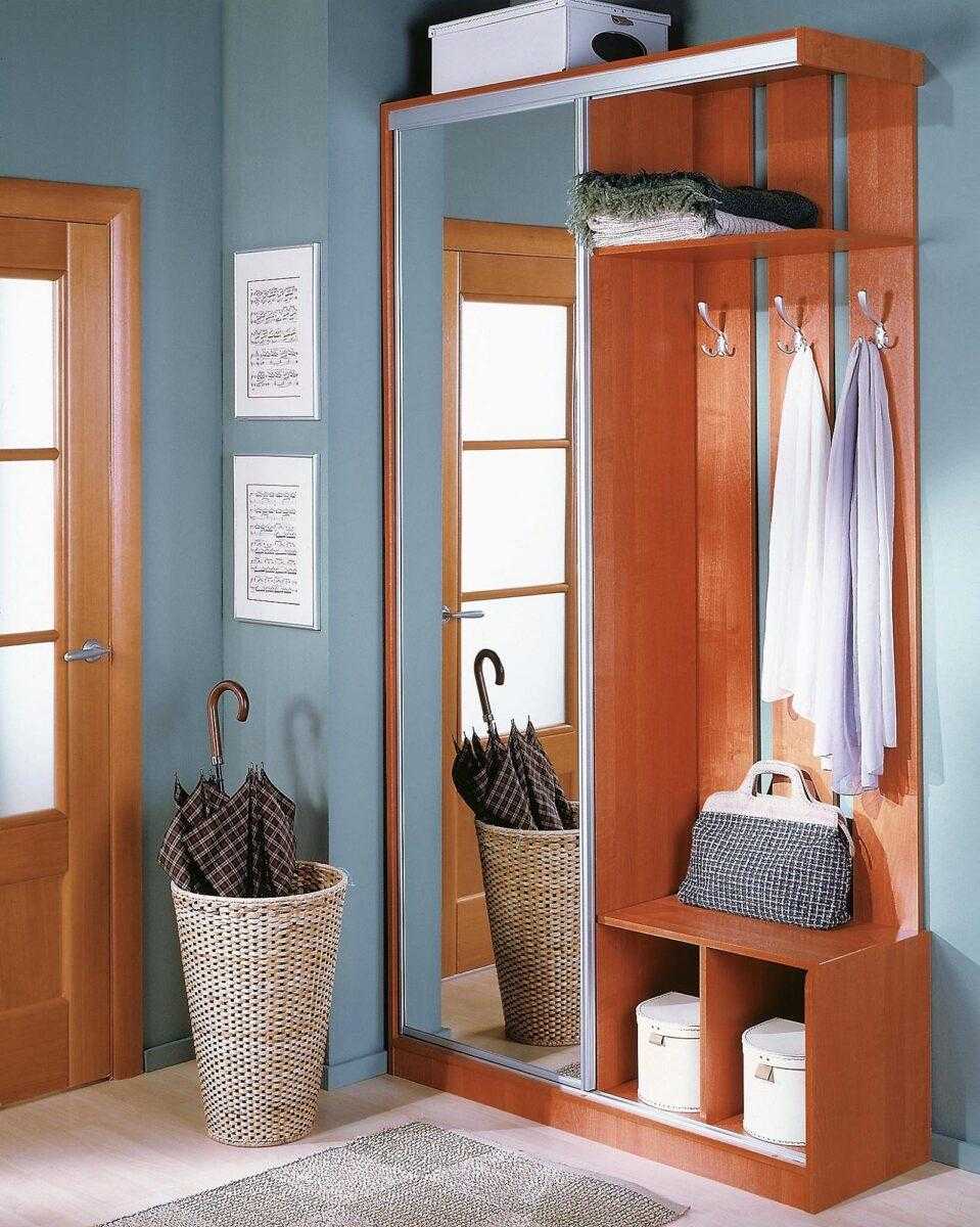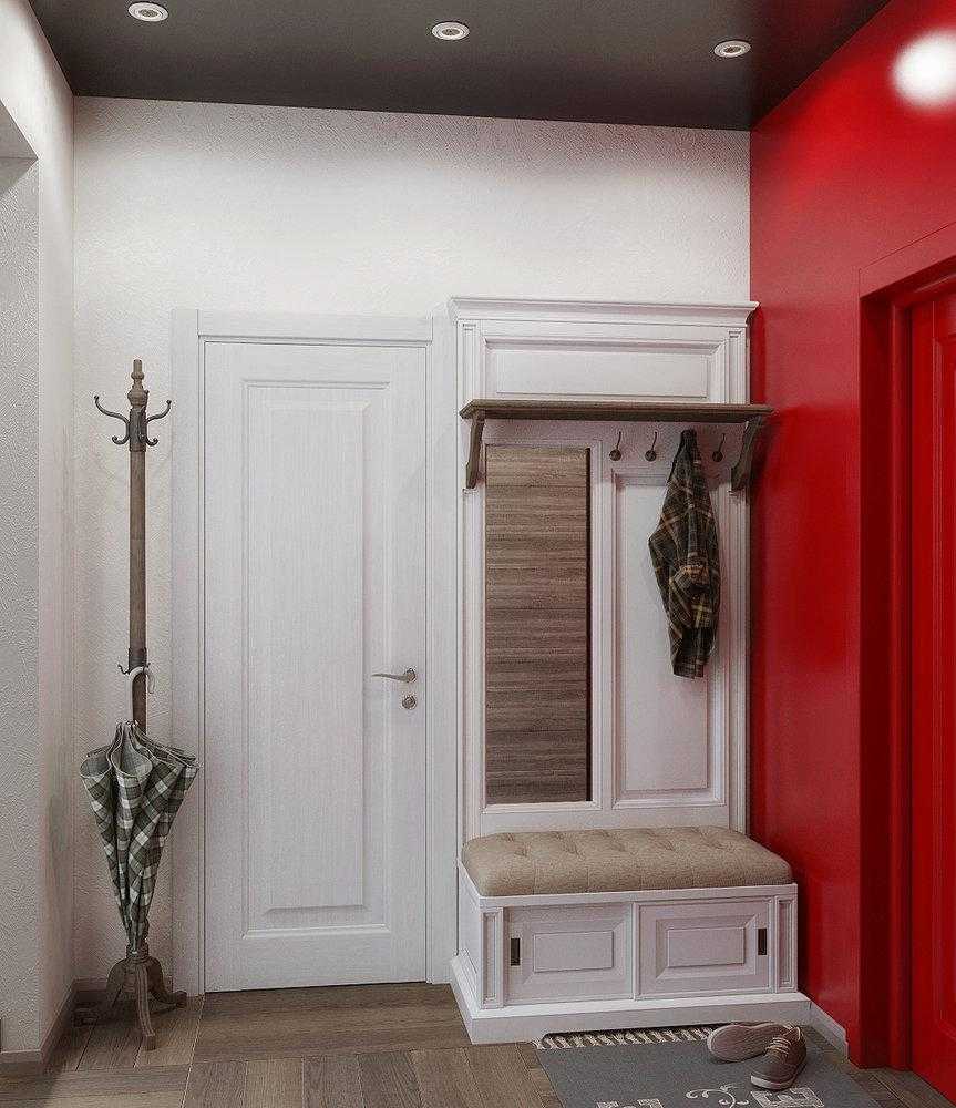 Небольшое помещение диктует свои правила: здесь придется обойтись необходимым минимумом. Допустим, установить тумбу-скамейку или маленький пуф, на который можно присесть, а сверху на стене расположить полку, оборудованную крючками для одежды. Настенное зеркало с декоративными элементами поможет удачно завершить оформление.