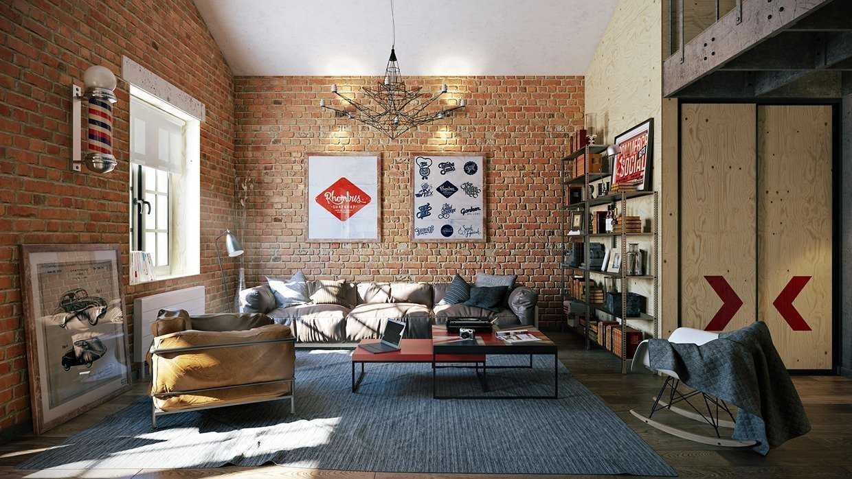 - Оформление спальной комнаты в стиле лофт (необработанные кирпичные стены, потолочные балки из бруса при наличии высоких потолков, отделка с помощью искусственно состаренных досок, граффити).