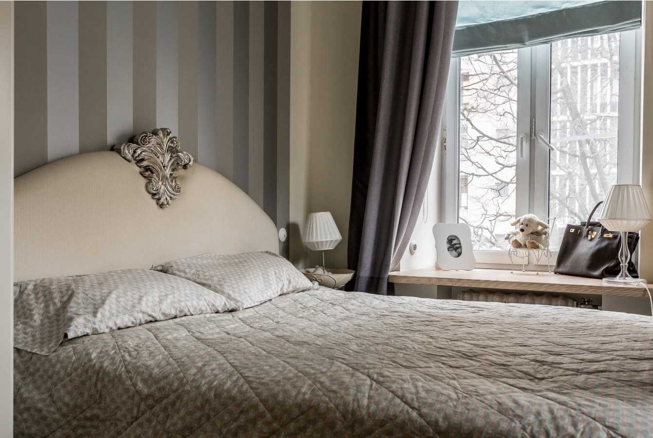 Диагональный узор. Этим приемом, позволяющим визуально увеличить маленькую спальню, пользуется большое количество дизайнеров.