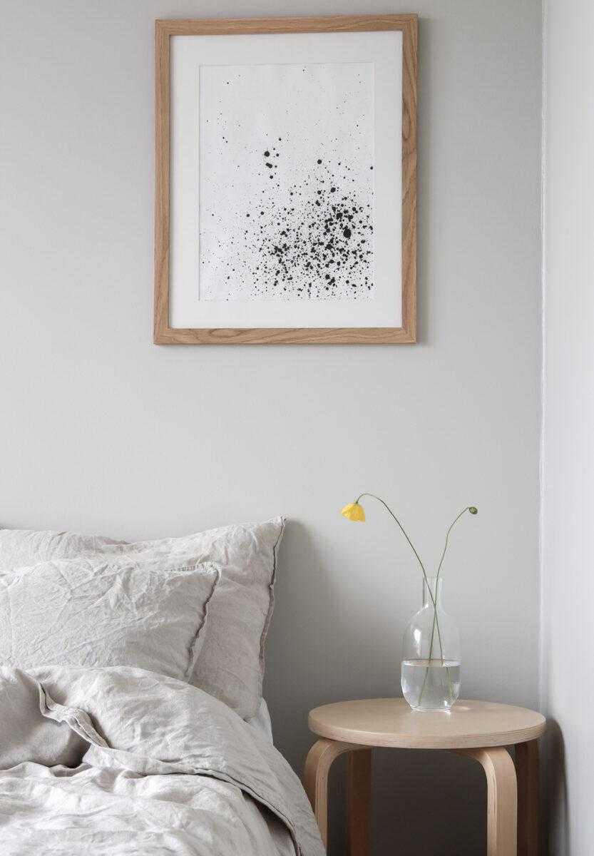 Яркие полосы, пятна или принты на нейтральной серой стене. В качестве акцентов можно использовать картины и постеры ярких цветов.