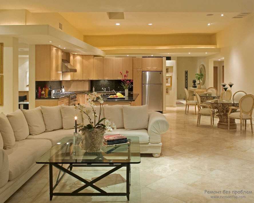 - Гостиная проходная. С такой комнатой работать будет сложнее всего. Тут необходимо правильно подобрать напольное покрытие, так как нагрузка на пол увеличится. Стоит применить качественные долговечные материалы.